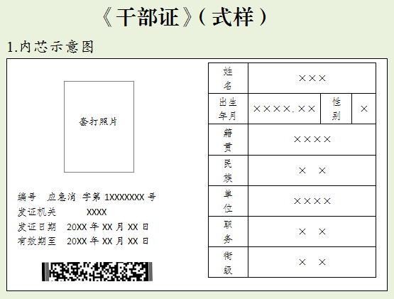 《干部证》《消防员证》设置姓名、出生年月、性别、籍贯、民族、单位、职务、衔级以及编号、发证机关、发证日期、有效期等栏,《退休证》设置姓名、出生年月、性别、籍贯、民族、原单位职务、批准退休时间、衔级、原职务(技术)等级以及编号、发证机关、发证日期、有效期等栏。持证人自然信息加密生成的二维码嵌印至内芯底部。《学员证》使用专用证芯,设置姓名、出生年月、性别、籍贯、民族、部别,以及编号、发证机关、发证日期、有效期等栏。