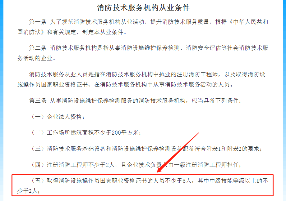 应急部关于印发《消防技术服务机构从业条件》的通知从事消防设施维护保养检测服务的消防技术服务机构取得消防设施操作员国家职业资格证书的人员不少于6人,其中中级技能等级以上的不少于2人。
