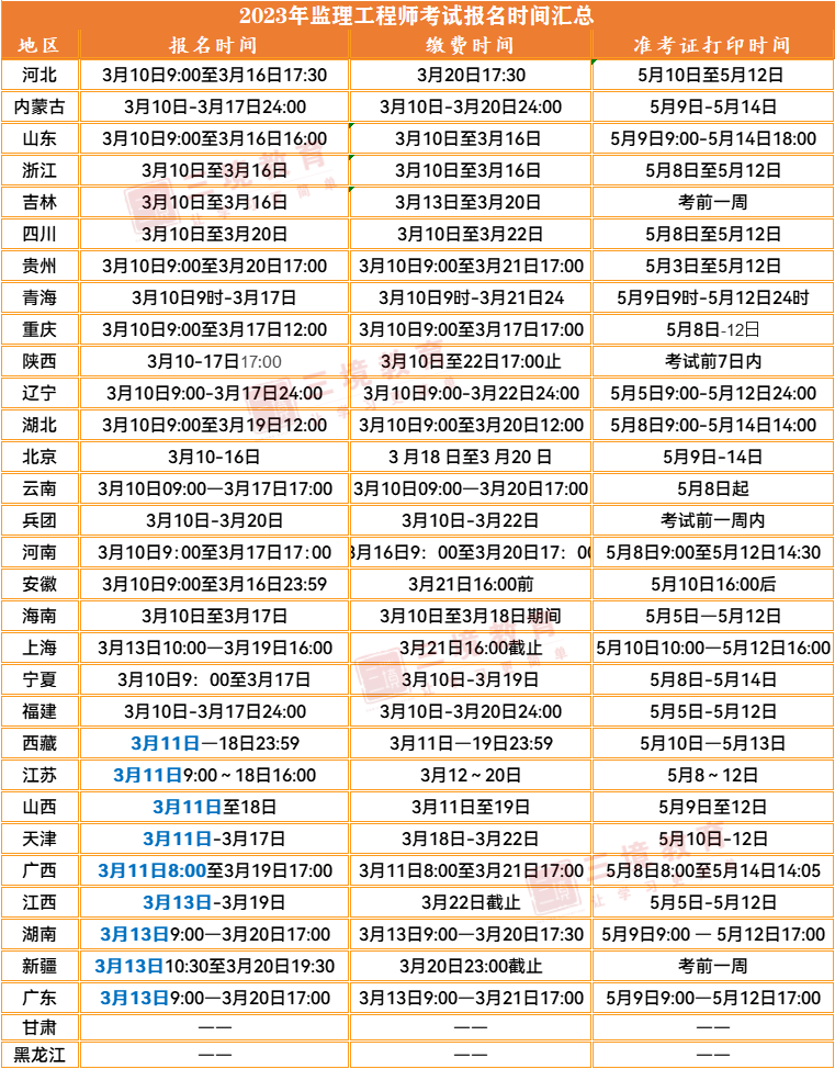 中国人事考试网2023年监理工程师报名入口已开通,2023年3月10日起开始,截止目前,已有(甘肃和黑龙江)2地外,其余省份均已发布监理工程师考试报名通知,各省报名时间不同,其中26地已开通报名入口,具体汇总如下↓↓