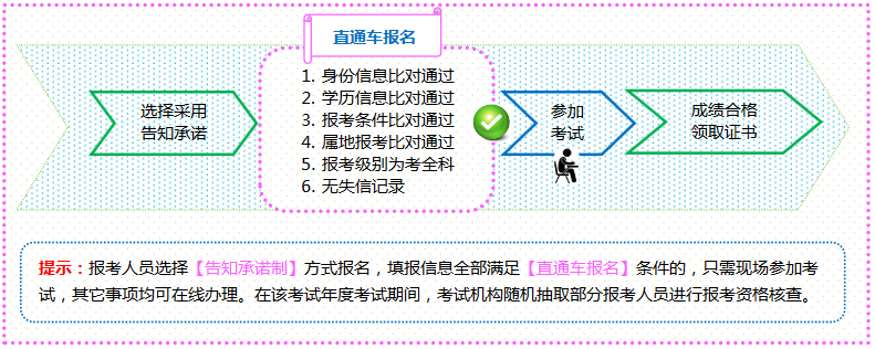 在线核查:报名系统对报考人员的学历学位、所学专业、工作年限等内容与报考特定条件相符合情况进行在线核查。系统核查通过后进入选择报名办理方式环节。