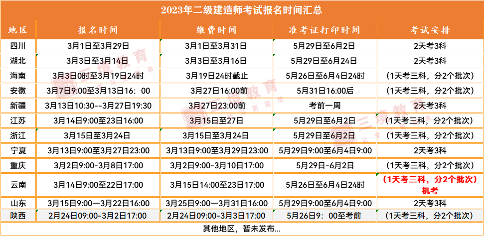 二建截至目前已经有12地发布了2023年考务通知,其中陕西已经报名结束;