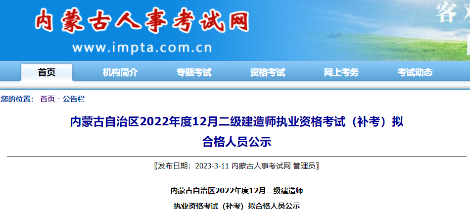 内蒙古公示22年度二建补考合格人数(872人),公示期为3月11-20日。