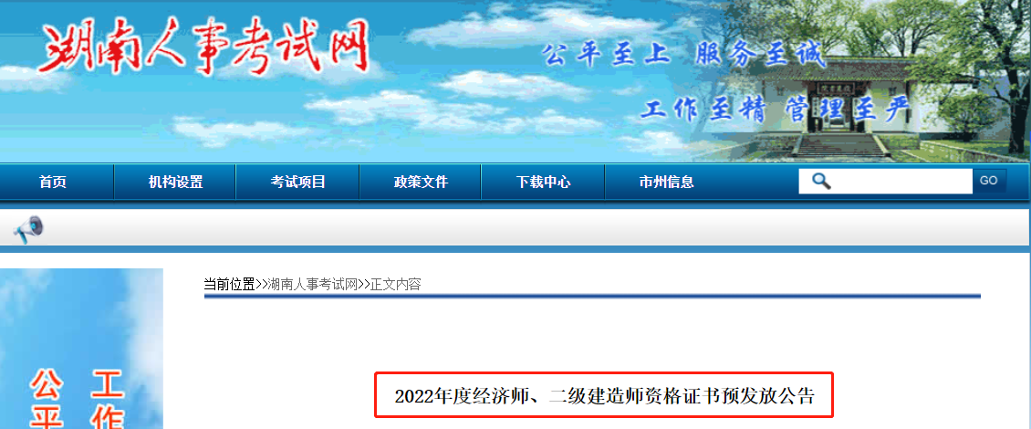 2022年度二级建造师及增项(12月份补审的于下一批发证,具体时间见公告),经济师(2022年开考考区)资格证书近期将按属地分发给各市州并陆续发放。为切实提高考试服务水平,方便广大考生,上述职业资格证书除继续提供现场领取证书服务外,同时提供证书邮寄网上申请服务,考生可自主选择。