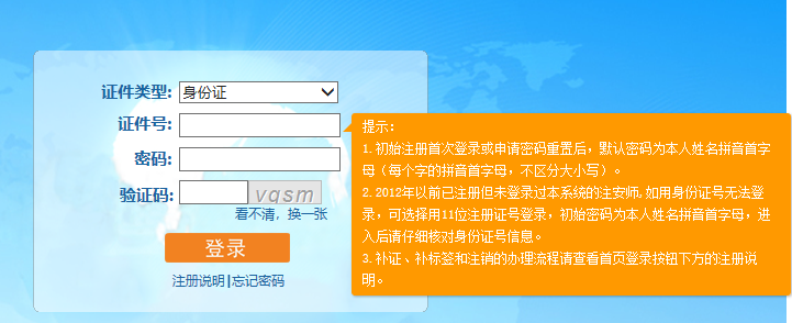2、2012年以前已注册但未登录过本系统的注安师,如用身份证号无法登录,可选择用11位注册证号登录,初始密码为本人姓名拼音首字母,进入后请仔细核对身份证号信息。具体操作流程